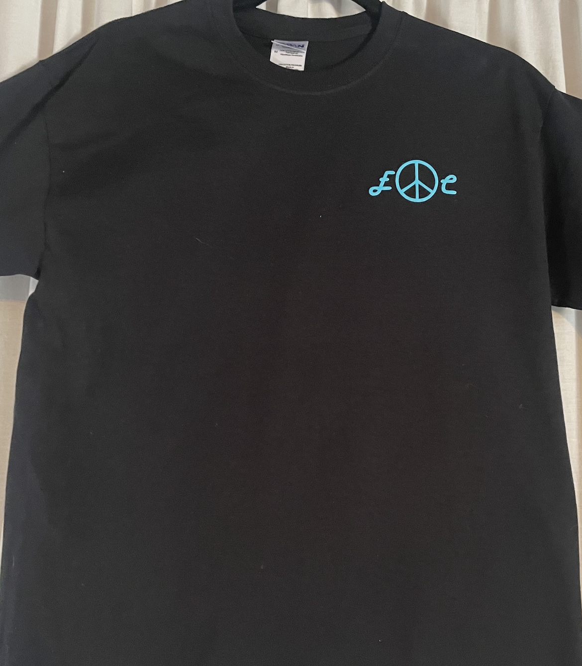 100% Cotton, Black T shirt with bright Turquoise “E” Peace Sign “C” Logo